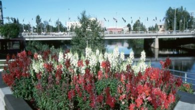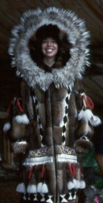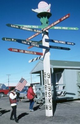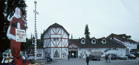 Chena and Tanana Rivers aboard the Riverboat Discovery III. On the way down we made a short stop at the home of Dave Monson and Susan Butcher, four time Iditarod Champion. On the way back up the river we made a visit to Old Chena Indian Village. There we got to see the champion Iditarod dog team in action. This is also where one of the cute native guides (above left) modeled a handmade Athabascan coat. ![]() After leaving Fairbanks I headed south on the Richardson Highway. My first stop was in North Pole, Alaska. This is one of Alaska's most unique communities. It is best known as the home of Santa Claus House where I did a little shopping. All the street lights in town look like giant candy canes.