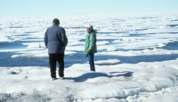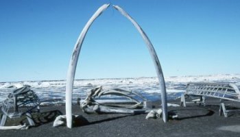 into the Arctic Circle. Barrow is the northernmost community in North America. The sun does not set here between May 10th and August 2 each summer, and does not rise between November 18th and January 24th each winter. The picture on the left is part of the Wiley Post-Will Rogers Memorial. They were killed here in 1935 after their plane crashed. The upper right photo is looking out onto the Chukchi Sea through the bone arch of a bowhead whale. The lower right picture shows the omnipresent icepack of the Arctic Ocean.