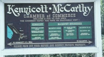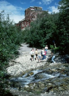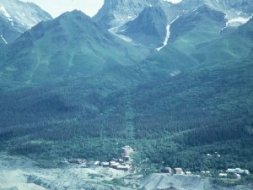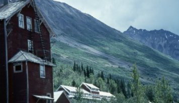McCarthy sprang up in 1910 with the development of the massive high grade copper deposits at the Kennicott Mine (right photo) and flourished until 1938 when it was abandoned. The Kennicott Lodge can be seen lower left.